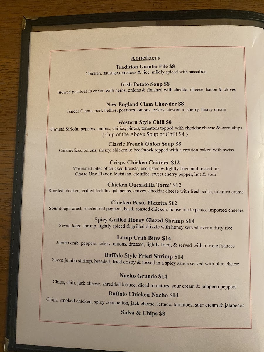 Chez Nous, located at 707 Union St, Schenectady, NY 12305, offers a delightful and varied menu that promises to satisfy a wide range of tastes. The appetizers are a hearty introduction to the meal, featuring dishes like the Tradition Gumbo Filé, Irish Potato Soup, and the comforting New England Clam Chowder. For those craving something with a bit of spice, the Western Style Chili and the rich Classic French Onion Soup are excellent choices.