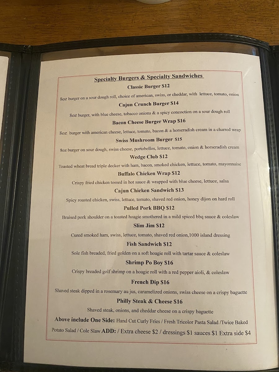 If you’re in the mood for a burger or sandwich, Chez Nous also offers some exciting options. The Classic Burger and Cajun Crunch Burger bring classic flavors with a twist, while the Bacon Cheese Burger Wrap provides a fun take on the traditional burger. For a more refined option, the Swiss Mushroom Burger is a delicious choice, and the Wedge Club is a perfect, filling sandwich for lunch or dinner.