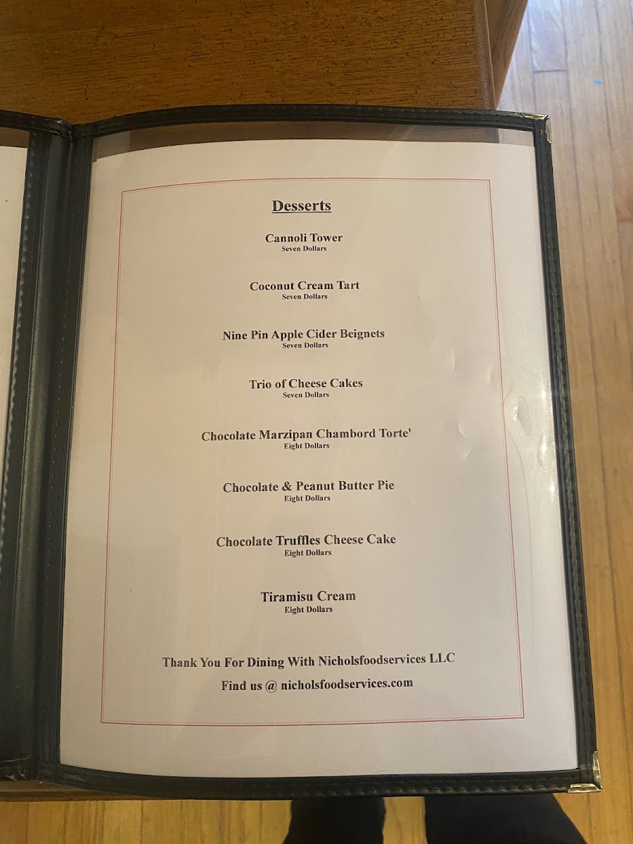 Desserts at Chez Nous are truly a treat. The Cannoli Tower and Coconut Cream Tart are perfect for anyone with a sweet tooth, while the Nine Pin Apple Cider Beignets offer a delightful twist on a traditional dessert. For cheesecake lovers, the Trio of Cheesecakes is a must-try, as is the indulgent Chocolate Marzipan Chambord Torte.
